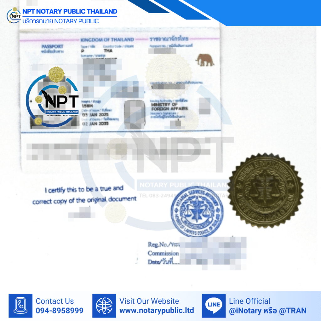 - การรับรองสำเนา (Certified True Copy): รับรองว่าสำเนาเอกสาร เช่น พาสปอร์ต หรือบัตรประชาชน ตรงกับต้นฉบับจริง