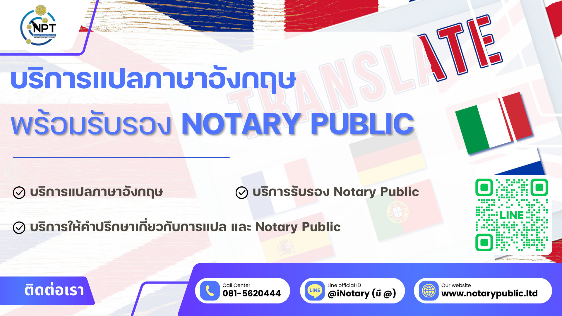 NPT Notary Public Thailand ผู้เชี่ยวชาญด้านการแปลภาษาอังกฤษ พร้อมบริการรับรองเอกสารโดยทนายความ (Notary Public) ด้วยประสบการณ์ยาวนาน เราพร้อมให้บริการแปลภาษาอังกฤษ ทุกประเภทเอกสาร อย่างถูกต้อง แม่นยำ รวดเร็ว และได้มาตรฐาน เพื่อตอบสนองความต้องการของลูกค้า ทั้งบุคคลทั่วไป นิติบุคคล หน่วยงานราชการ นักเรียน นักศึกษา และบริษัทต่างชาติ
